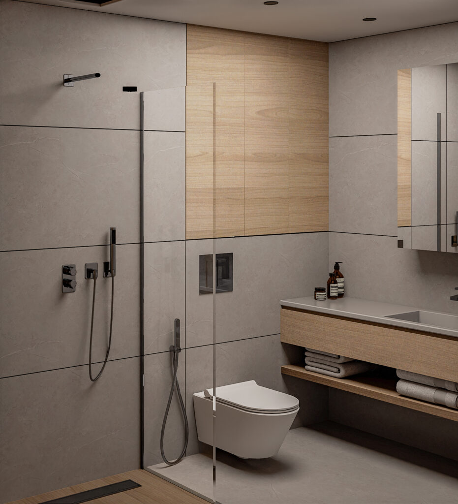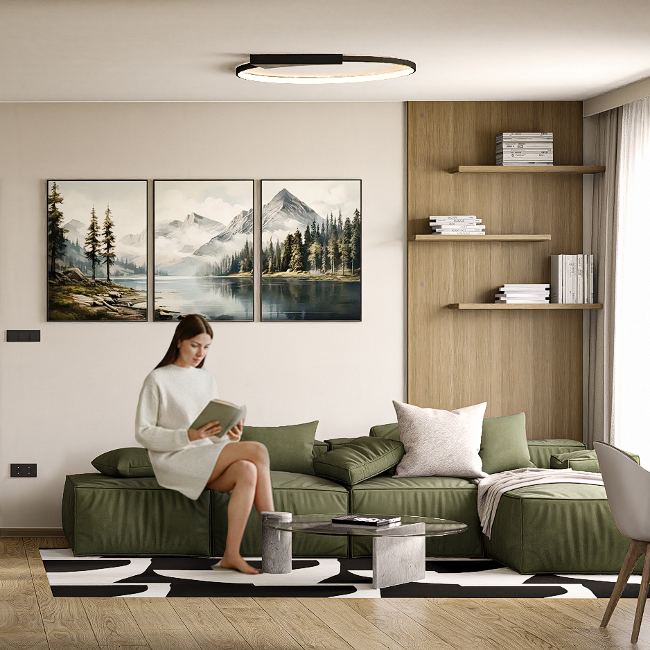 Проектирахме този интериор с идеята за спокойствие, светлина и усещане за лекота. Заложихме на изчистени линии и балансирана цветова палитра, в която топлите дървесни тонове и неутралните сиви създават хармонична основа. Меката, модулна система е сърцето на пространството – удобна, но визуално лека, тя приканва към почивка без да доминира.