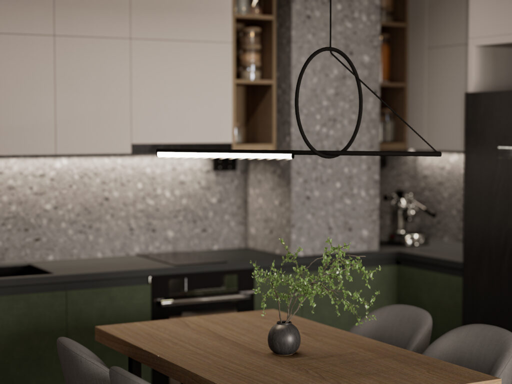 Кухненският остров е ключов елемент в композицията – той организира пространството и създава място за общуване, без да нарушава визуалния баланс. Вграденото осветление и акцентните черни детайли добавят дълбочина и графичност, а отворените ниши внасят усещане за лекота и персонален акцент. Това е кухня, създадена с внимание към детайла и ежедневието – естетична, функционална и ненатрапчива.