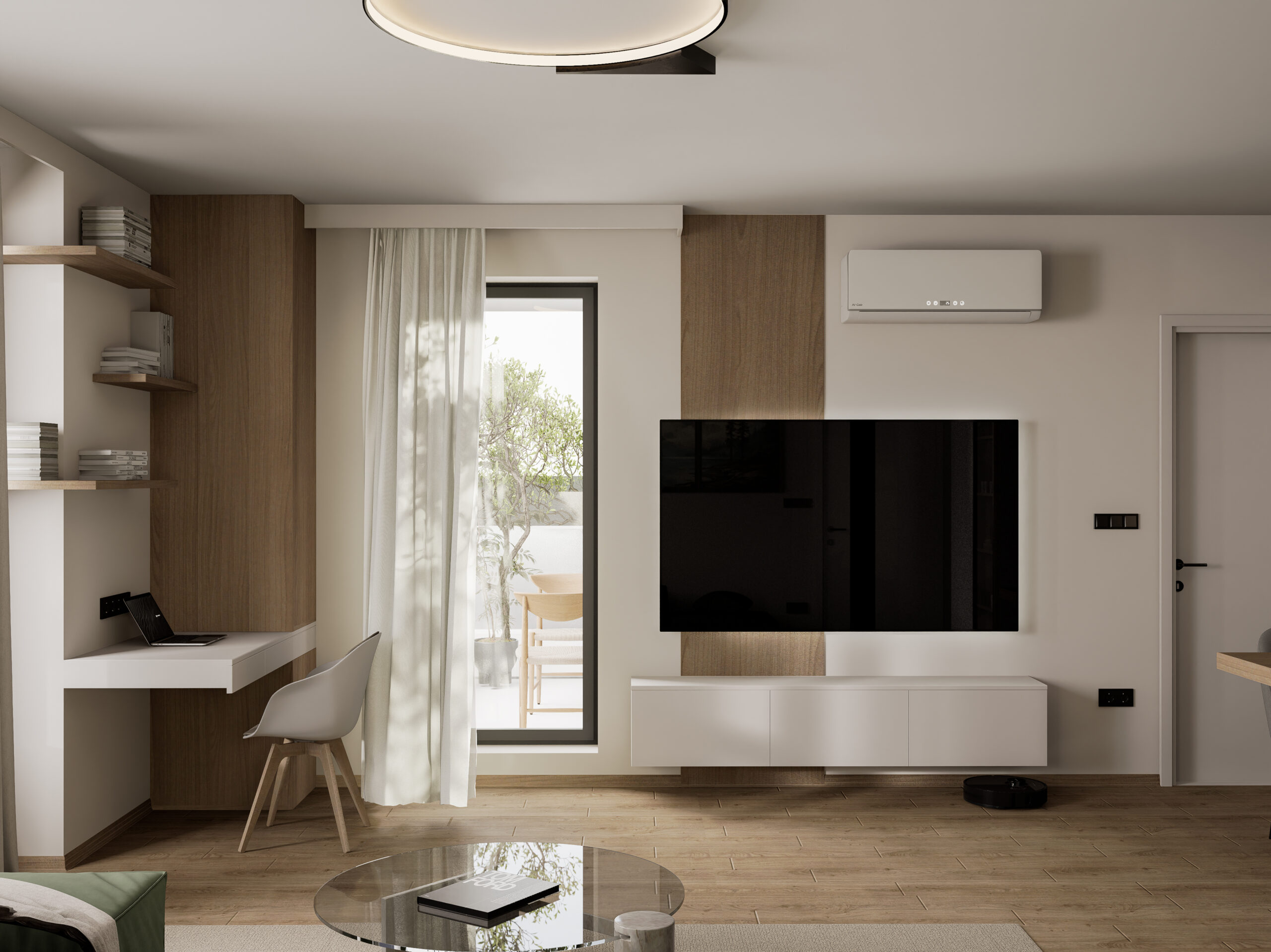 Проектирахме този интериор с идеята за спокойствие, светлина и усещане за лекота. Заложихме на изчистени линии и балансирана цветова палитра, в която топлите дървесни тонове и неутралните сиви създават хармонична основа. Меката, модулна система е сърцето на пространството – удобна, но визуално лека, тя приканва към почивка без да доминира.