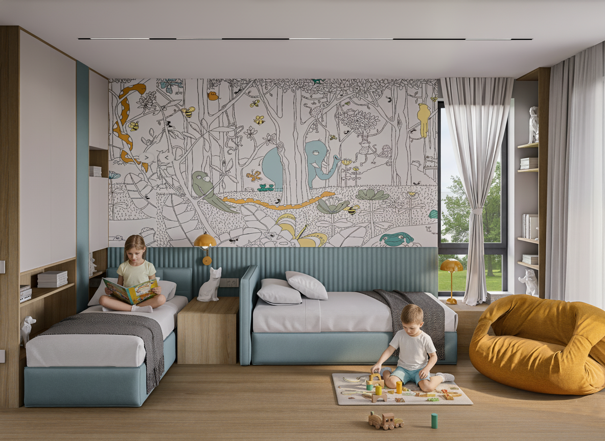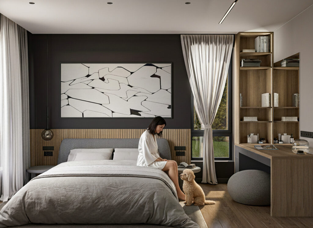 Работихме с топла, неутрална палитра и богати на текстура материали – дърво, текстил и фино структурирани стенни облицовки, които придават дълбочина и характер, без да натоварват пространството. Всеки елемент е подбран с внимание към мащаба и тактилното усещане.